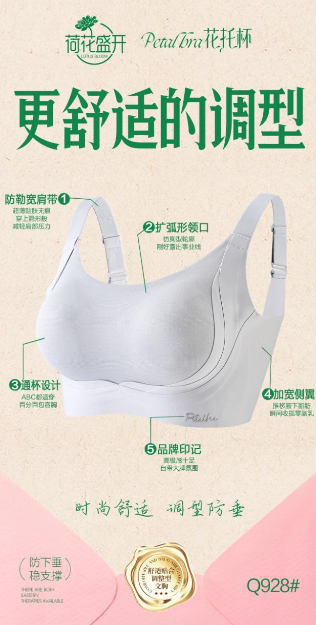 “从设计到工艺,每一处细节都致力于打破传统调整型文胸的束缚,用贴心设计打造舒适调整体验,让花托杯成为日常穿搭里的优雅亮点!” 这是荷花盛开花托杯的设计初心,更是其打动消费者的关键。杯体采用蜂巢透气棉材质,每平方厘米 380 个透气微孔构建空气环流系统,告别闷热黏腻,时刻保持肌肤干爽;边缘采用无痕包边工艺,搭配柔软亲肤的抑菌面料,搭配紧身服饰时完全隐形,解决传统内衣的勒痕尴尬。无论是职场通勤的衬衫穿搭,还是日常休闲的简约造型,花托杯都能以 “隐形塑形” 的优势,为女性增添不经意的优雅气质。