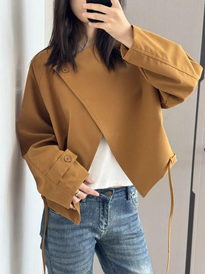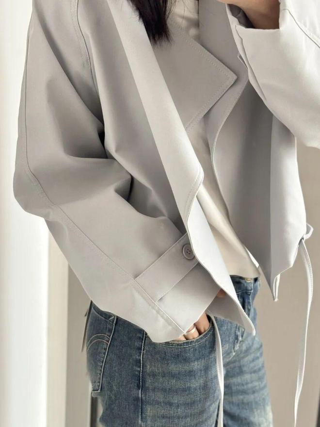 面料是那种软软糯糯的触感,但上身一点都不塌,版型超挺的,就是那种很风衣的料子。