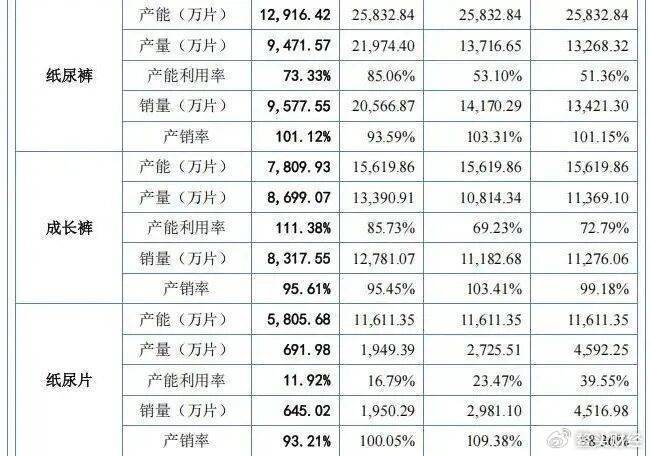 值得注意的是,2022年至2024年,英氏控股纸尿片的产能利用率分别为39.55%、23.47%和16.79%,一直处于较低水平,且呈下降趋势。