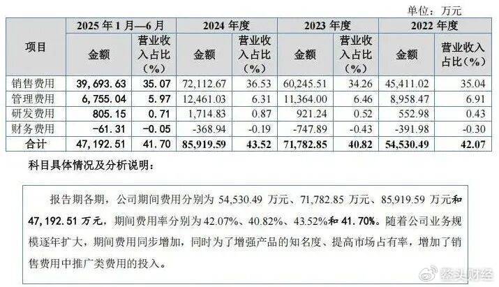 对比来看,2022年至2024年以及2025年上半年,英氏控股销售费用分别为4.54亿元、6.02亿元、7.21亿元和3.97亿元,三年半合计21.74亿元,约占营业收入的35%,为研发费用的54倍。